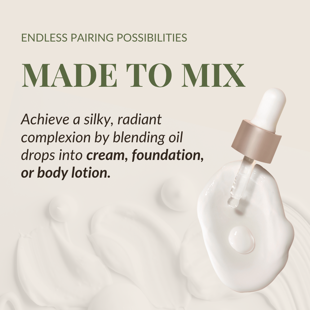 Transform your beauty routine with this game-changing treatment. Simply blend drops of this oil into your favorite cream, foundation, or body lotion to achieve a silky, radiant complexion. Not only is the oil aromatic and soothing, but it also enriches every area it touches, including your face, body, nails, and hair, leaving you with an all-over glow.